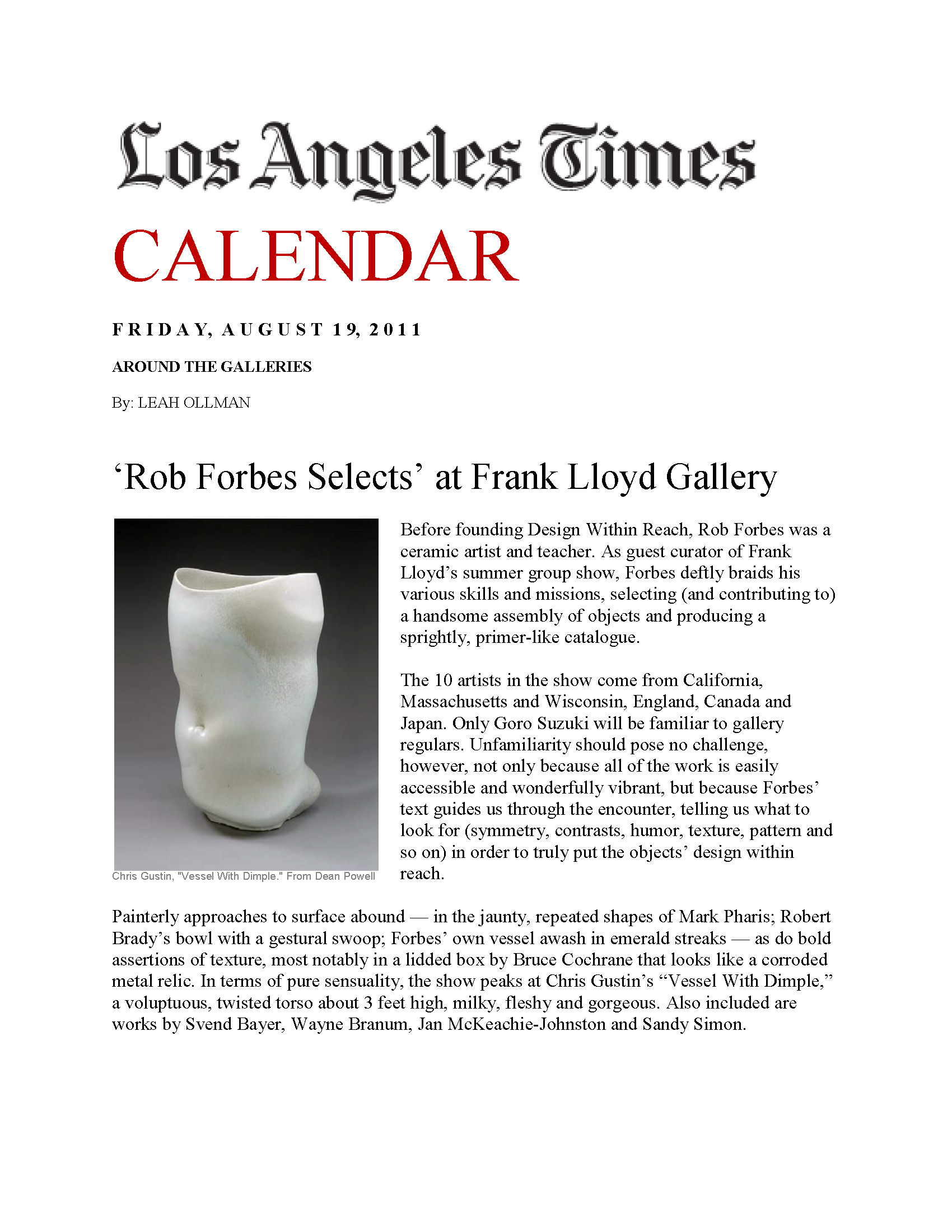 Ollman, Leah. "'Rob Forbes Selects' at Frank Lloyd Gallery." Los Angeles Times, August 19, 2011.