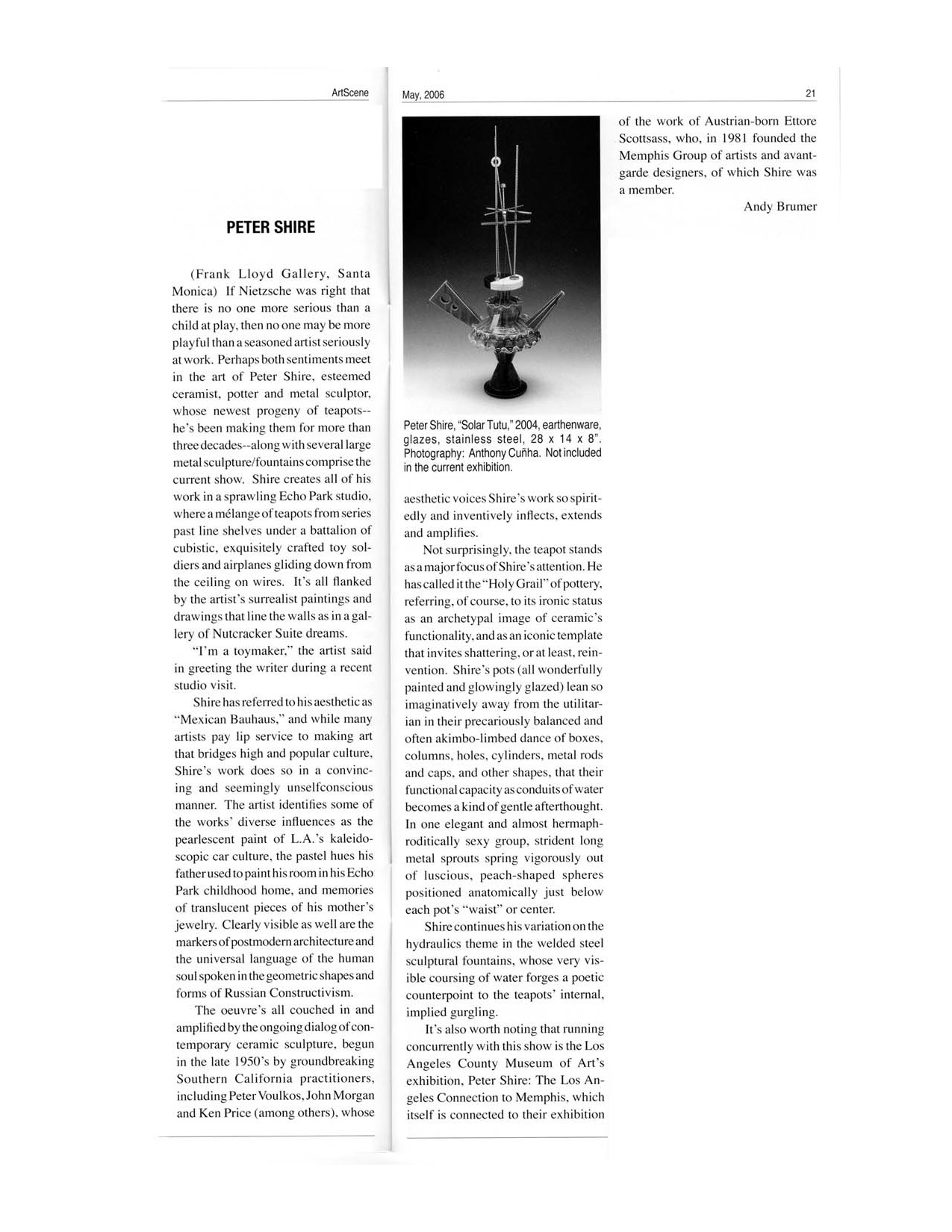 Brumer, Andy, "Peter Shire." ArtScene. (May 2006), p. 21.