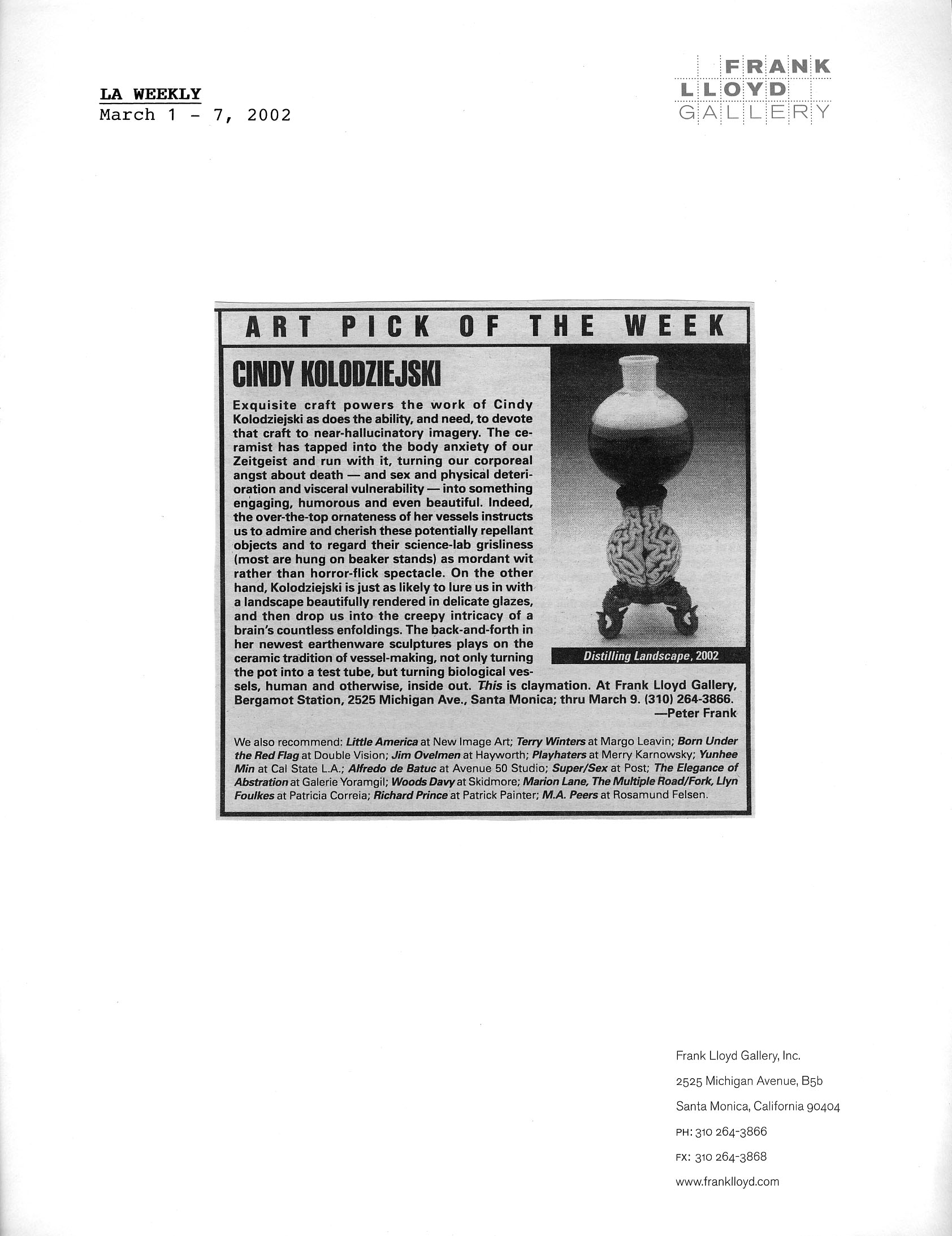 The works in "Specimens" mark a major breakthrough for Cindy Kolodziejski. In her previous pieces, the familiar domestic vessel (vase, tureen, or teapot) was transformed by the addition of unusual narrative imagery that often juxtaposed incongruous themes. The forms were altered by the inclusion of strange feet and handles, or the grafting of Victorian finials above a vase with a claw-footed base. In this show of seven new works, however, the artist has used the forms of vintage laboratory equipment to display foreboding and disturbing new images. Where she once presented more conventional ceramic vessels with provocative pictures, Kolodziejski's images now seem to be contained in a laboratory beaker of the mind.