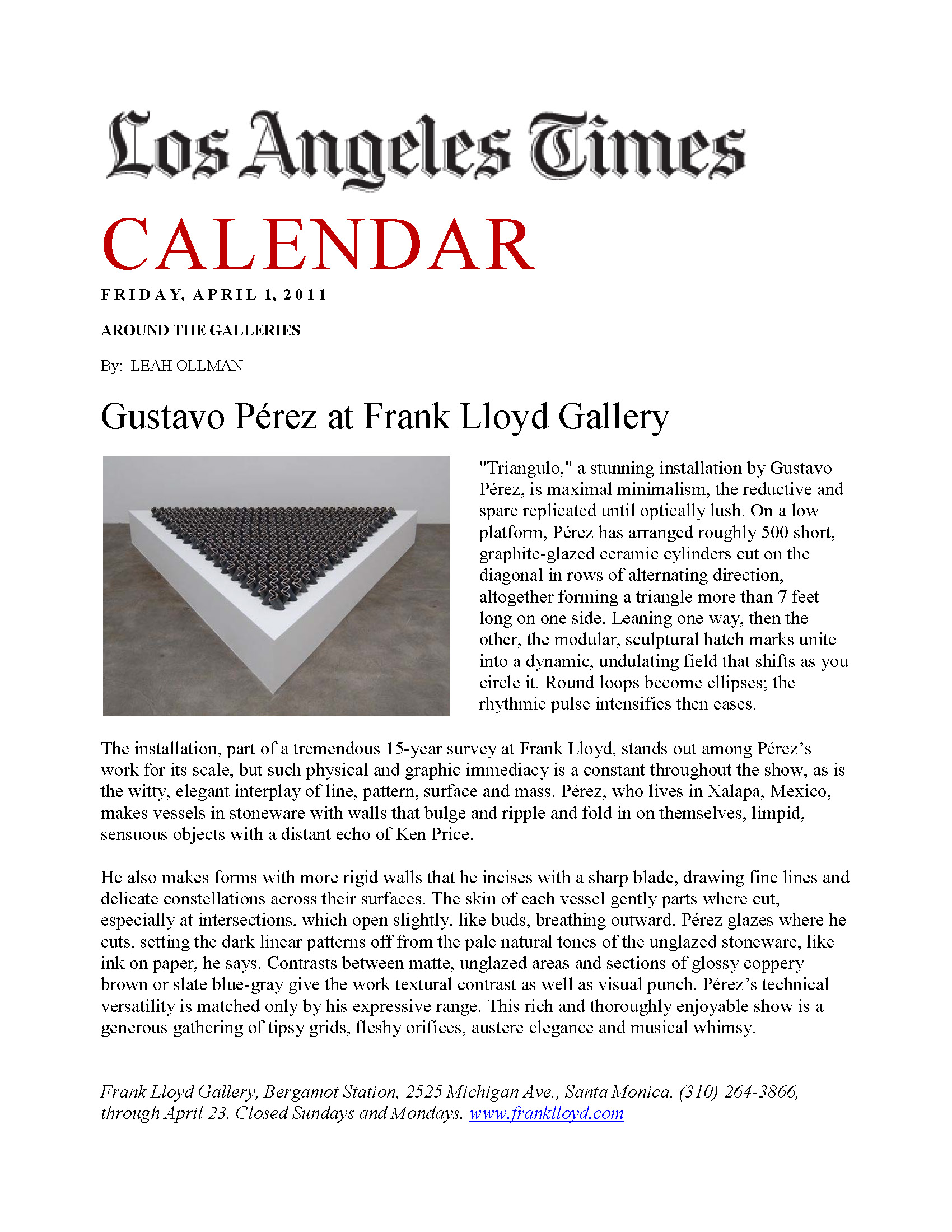 This will be the seventh solo exhibition of Perez's work at the gallery. Two large scale examples of his work are included in this show, Triangulo and Tablero. The installation piece Triangulo is composed of dozens of small cylinders, cut at a precise angle and placed face-to-face in opposition. The sculpture forms an equilateral triangle, and though it is based in geometry alludes simultaneously to minimal art and optical illusion. Tablero is a wall relief, composed of 49 small abstract forms. Although the individual pieces are made by straightforward folding and forming of the clay, the resulting image has a primitive presence.