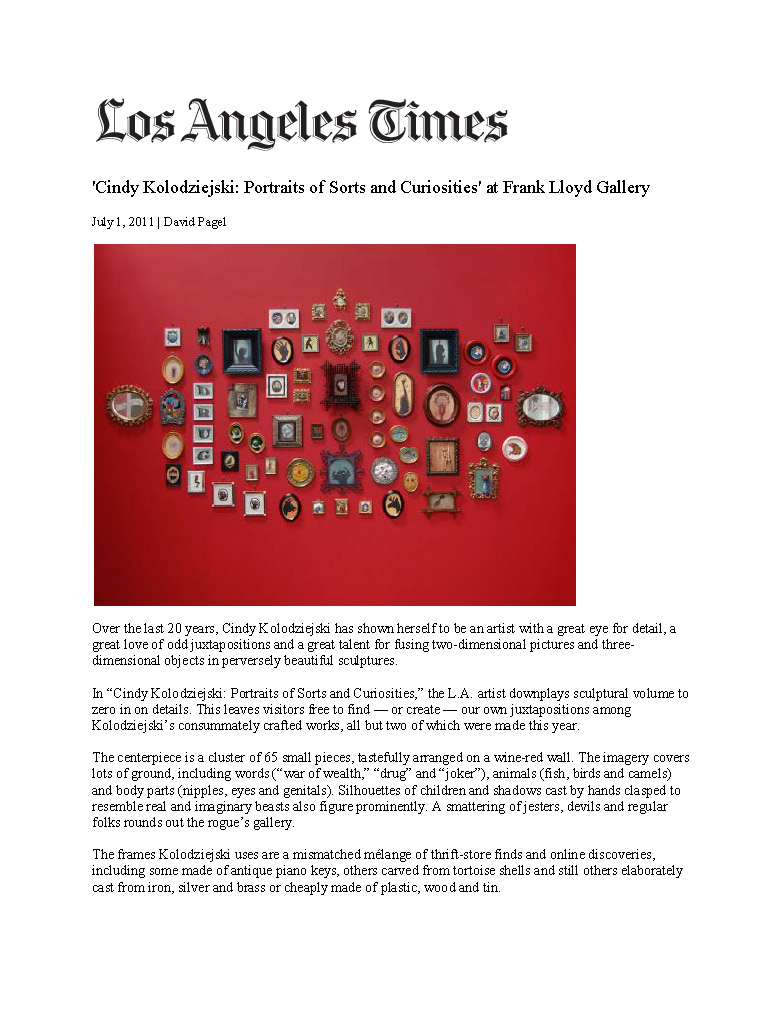 Cindy Kolodziejski lives and works in Venice, California. Born in Augsburg, Germany, Ms. Kolodziejski has had fifteen one-person shows since 1986. Her work is in the collections of the Los Angeles County Museum of Art, the Long Beach Museum of Art, and the Newark Museum, among others.