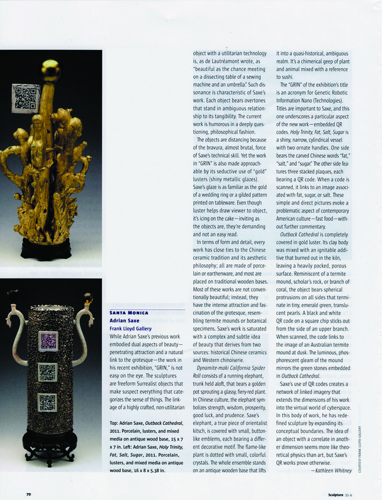 Saxe has worked with the ceramic vessel because he saw the opportunity to address complex social and cultural issues in a format accessible to a broad audience. Since the early 1980s, Saxe has sought to reinvent a role for ceramic art that employs decorative art conventions to comment on social and cultural expectations surrounding a number of topical themes. Some of these themes are explored in his new exhibition, GRIN—Genetic Robotic Information Nano (Technologies).