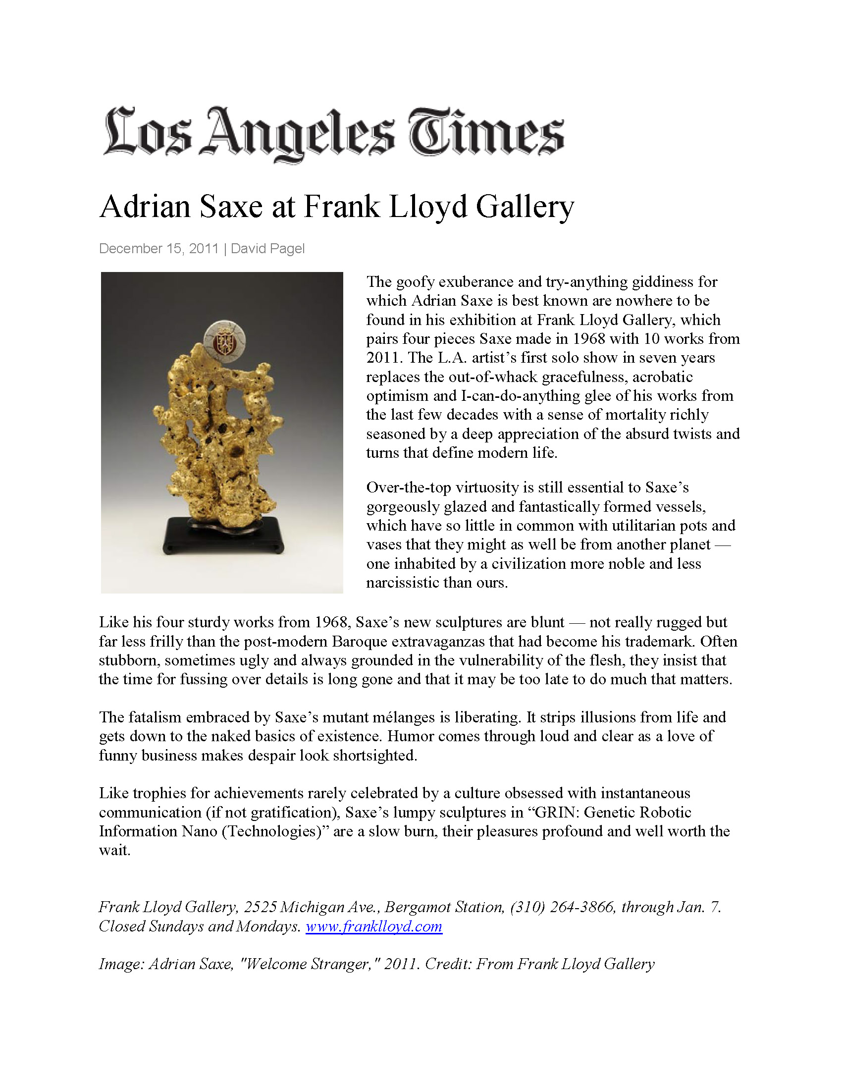 Christopher Knight of the Los Angeles Times has written, "With outrageous humor and unspeakable beauty, [Saxe] makes intensely seductive objects that exploit traditional anthropomorphic qualities associated with ceramics. Having pressed the question of the utility of his own art in a post-industrial world, his work engages us in a dialogue about our own place in a radically shifting cultural universe."