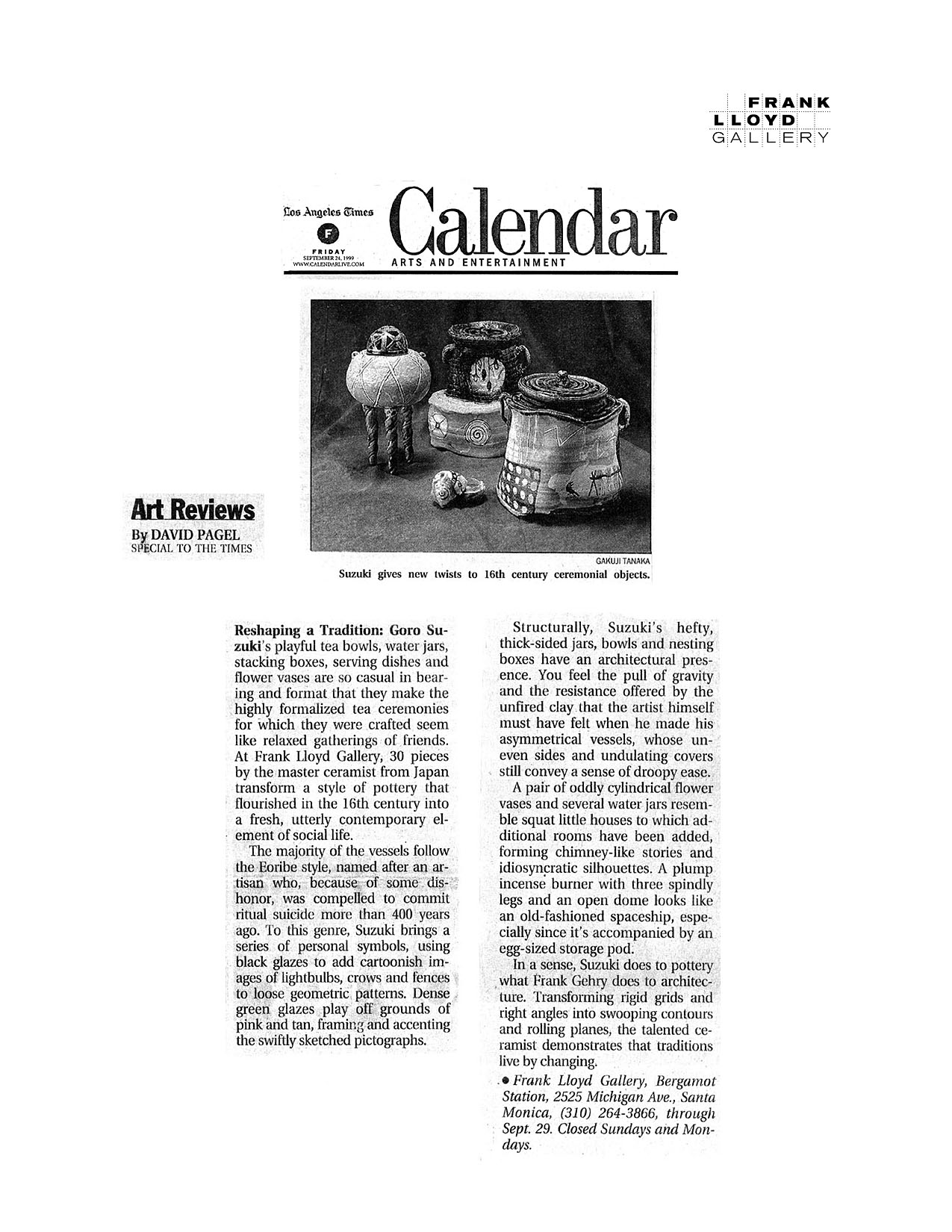 Reshaping a Tradition: Goro Suzuki’s playful tea bowls, water jars, stacking boxes, serving dishes and flower vases are so casual in bearing and format that they make the highly formalized tea ceremonies for which they were crafted seem like relaxed gatherings of friends. At Frank Lloyd Gallery, 30 pieces by the master ceramist from Japan transform a style of pottery that flourished in the 16th century into a fresh, utterly contemporary element of social life.