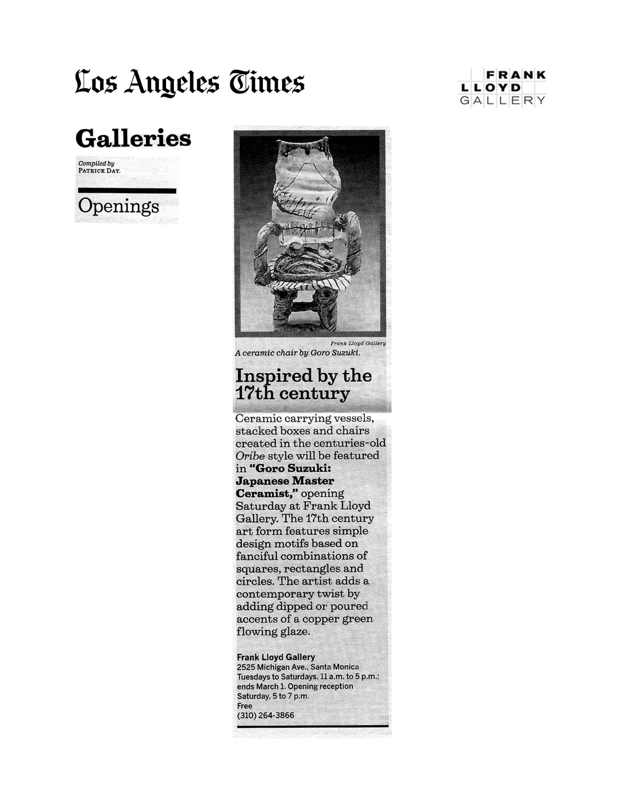 The Frank Lloyd Gallery has presented Suzuki's work twice in recent years. The first show, in 1998, featured rustic teapots, full of asymmetric architecture and brushed surface design. The second show, in 1999, concentrated on the tea ceremony, a highly refined Japanese ritual.