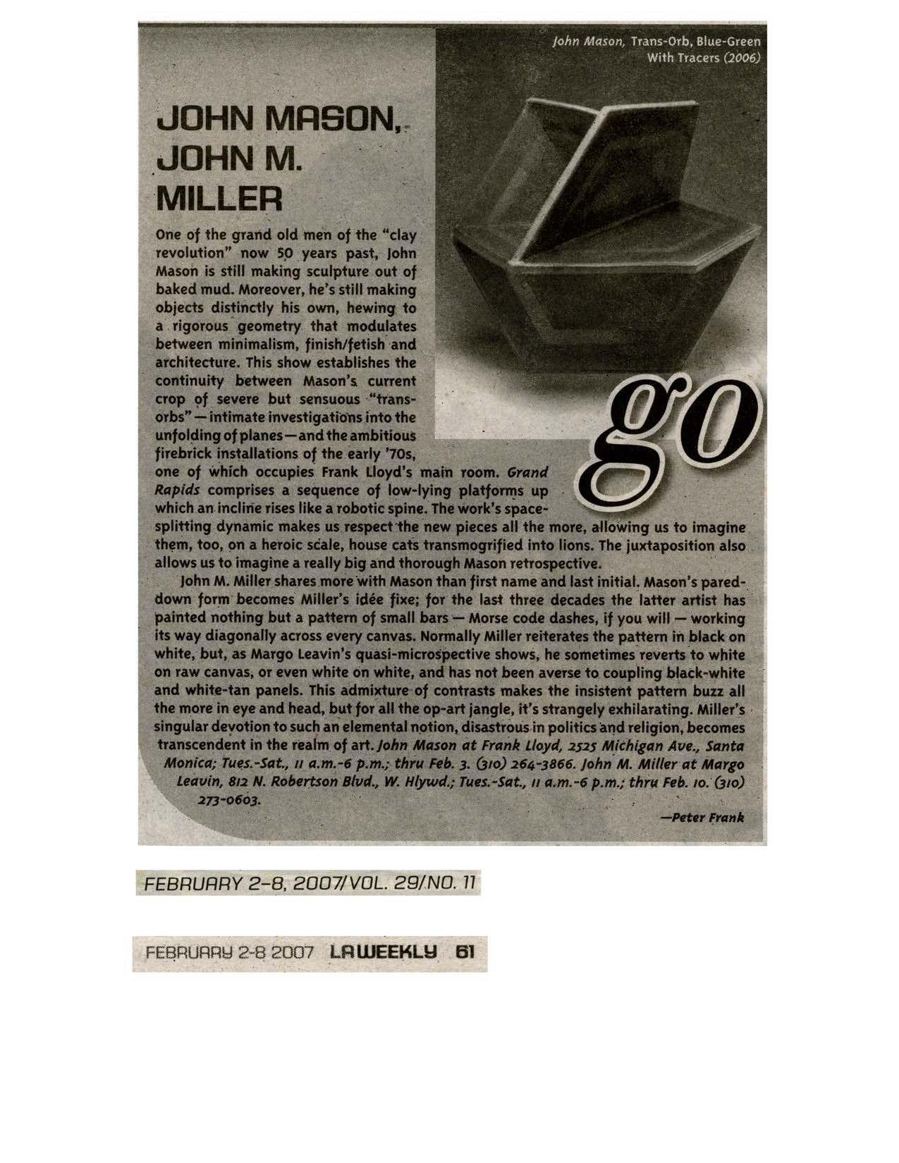 John Mason is one of the most important artists working in Los Angeles today. Since the late 1950s, when he exhibited at the legendary Ferus Gallery, Mason has had one-man shows at the Pasadena Museum of Art (1960 and 1974), the Los Angeles County Museum (1966), the San Francisco Museum of Modern Art (1978), and the Hudson River Museum (1978), among others.